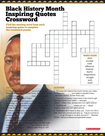 Black history crossword puzzle. › black-history-monthBlack History Month | Definitions by Dictionary.com Jan 27, 2021 · Each year, Black History Month is given a theme. “ Black Health and Wellness ” was t he theme chosen for 2022. Black History Month was first observed in the UK in 1987. Many organizations offer resources for educating students and the public about Black history not just during Black History Month but throughout the entire year. › stem-ed-resources › black-historyBlack History Month: A Crossword Puzzle | NASA Black History Month: A Crossword Puzzle | NASA ... Loading ... › more › wynneBrief History of Crossword Puzzles Crossword puzzles are said to be the most popular and widespread word game in the world, yet have a short history. The first crosswords appeared in England during the 19th century. They were of an elementary kind, apparently derived from the word square, a group of words arranged so the letters read alike vertically and horizontally, and ... How to Create Your Very Own Crossword Puzzle - McSweeney’s ... 15/03/2019 · Recently, I got my very first crossword puzzle accepted by a real-life newspaper. Since this basically means that I’m a puzzle-making genius (and not, you know, super unqualified to write this kind of article), I thought I’d share some …