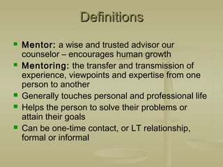 Home | Wise Owl Advisors We are a team of advisors that can help ease the anxiety of navigating these stressful times for seniors. We individually bring a unique service to help cover these areas where you may have questions, such as elder law, insurance, assisted living and downsizing. We are committed to give you the best resources possible! As originally defined mentoring was a process where a wise ... as originally defined, mentoring was a process where a wise and trusted advisor helped a less experienced person or professional. 9 , 10 over time, this definition has evolved, with some theorists suggesting that mentoring must also be a voluntary relationship of equality, openness, and trust between the counselor and the counselee. 11 other …